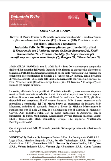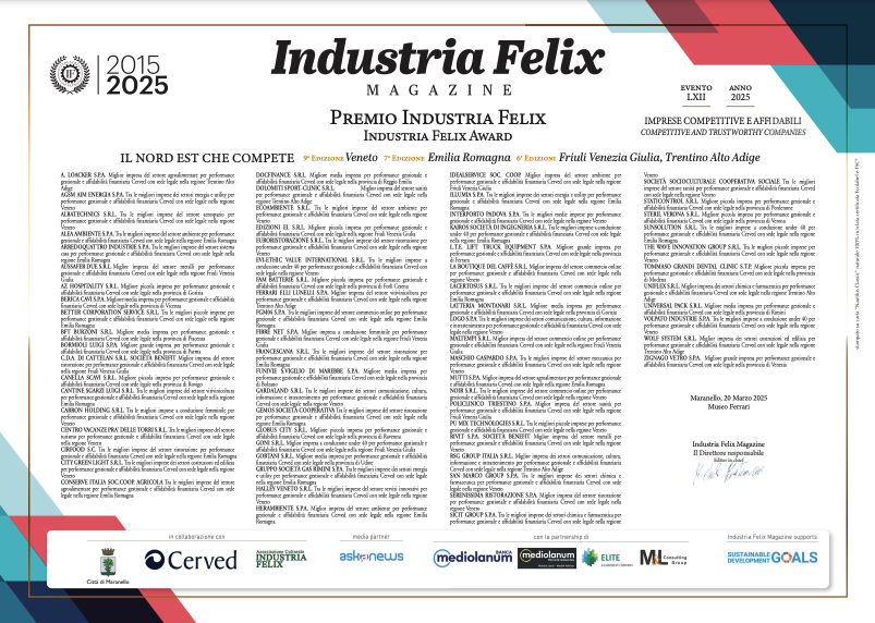 Il Premio Industria Felix, fondato dal giornalista Michele Montemurro e organizzato da Industria Felix Magazine, viene assegnato sulla base di una rigorosa analisi dei bilanci aziendali condotta in collaborazione con l’Ufficio Studi di Cerved. La selezione avviene attraverso un algoritmo incontrovertibile che esamina le performance gestionali di 700.000 società di capitali con fatturati superiori al milione di euro. A questo si aggiunge una valutazione approfondita dell’affidabilità finanziaria, determinata dal Cerved Group Score, e della reputazione aziendale, elemento sempre più centrale nel panorama economico moderno.